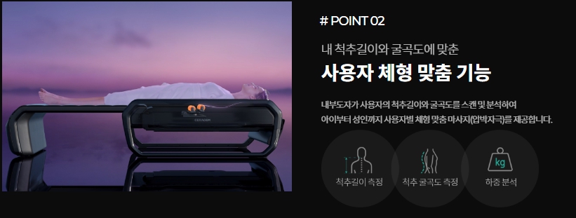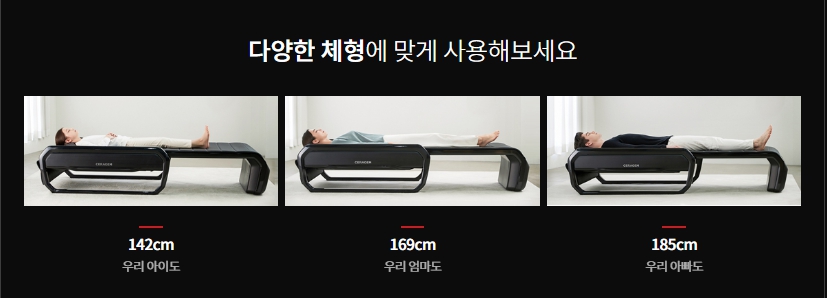사용자의 척추 길이와 굴곡에 맞춘 체형맞춤 기능을 갖추어 사용자에게 맞는 마사지를 제공합니다.