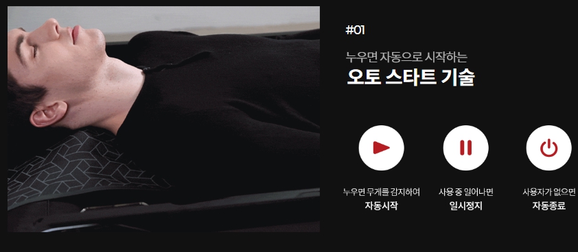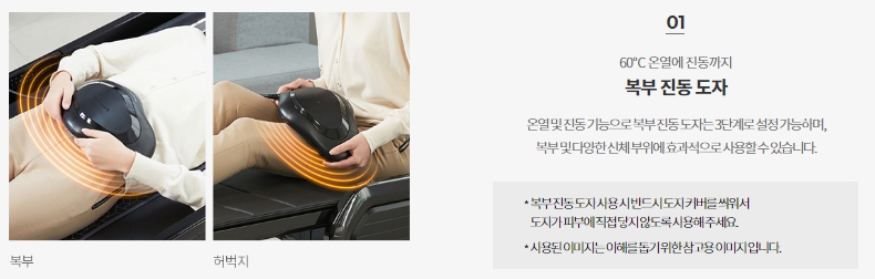또한, 마사지와 온열 기능은 별도로 분리하여 사용할 수 있으며, 온열을 원치 않을 때는 온열 기능을 작동시키지 않도록 분리된 디자인을 적용하였습니다.