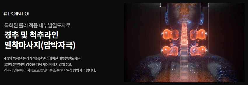 특화된 롤러와 내부 발열 도자를 사용하여 경추 및 척추 라인에 밀착된 마사지를 제공합니다.