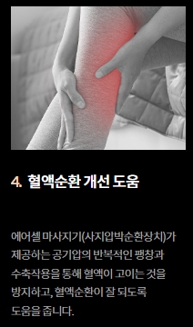 뿐만 아니라, 의료용 진동기를 이용하여 몸에 에너지를 전달하여 혈액순환이 원활하게 유지되도록 도와주고, 혈액이 뭉치는 것을 방지하며 주기적으로 슬리브 등을 부풀려 몸을 압박해주는 사지 압박 순환장치가 포함되어 있습니다.