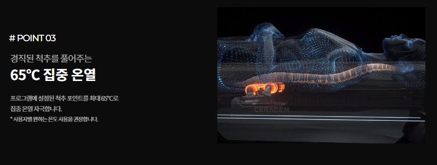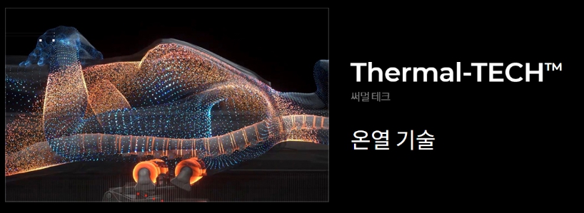 써멀테크(온열 기술)의 표층열 치료방법을 활용한 온열은 본 제품의 전체에 구비된 발열체와 열선을 통해 이용자의 전신에 효과적인 온열을 제공합니다.