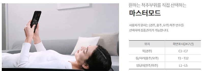 초기 사용 시 온열이 강하게 느껴질 수 있어 조절이 필요하며, 마스터 모드를 사용하면 원하는 척추 부위를 선택하여 집중적으로 관리할 수 있습니다.