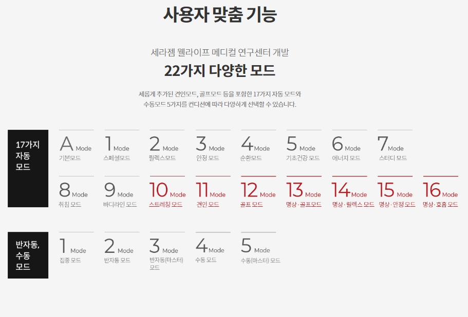총 22가지 모드 중 경인 모드와 집중 모드를 비롯한 다양한 마사지 모드를 제공합니다.