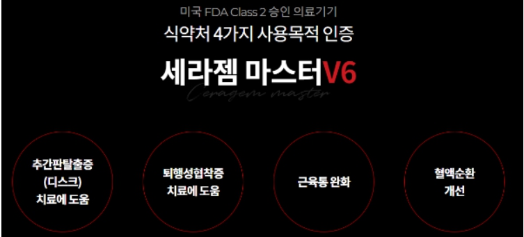 세라젬은 미국FDA 승인을 받았으며, 국내 식약처에서 근육통 완화, 혈액 순환 개선, 추간판 탈출증, 퇴행성 협착증 치료에 도움이 되는 4가지 목적으로 인증을 받았습니다.