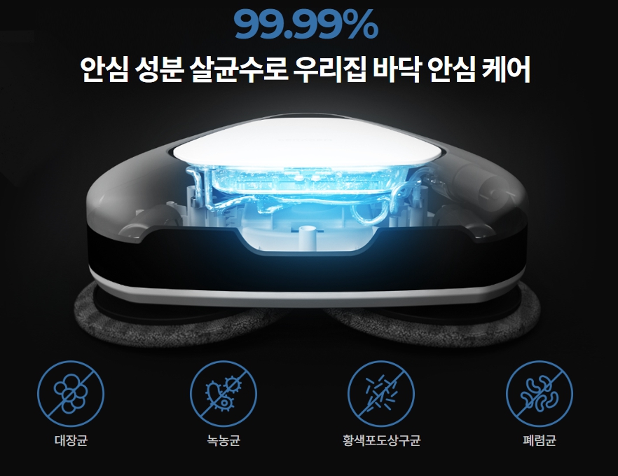 또한, 세라봇S는 안심 살균수 기능을 통해 바닥의 다양한 세균을 99.9%까지 살균할 수 있습니다. 이를 위해 살균수가 적절히 분사된 걸레패드를 크레들에 올려놓고 세라봇에 장착하여 사용합니다.